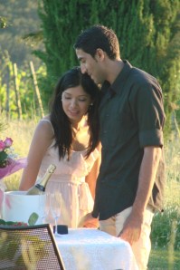 La loro tenuta è immersa tra le vigne, dove producono un ottimo Chianti e propio dietro alla piscina c’è un viale lungo il quale s’innalzano dei cipressi, vigne e colline sparse di ville e coloniche a rendere ancora più magico il panorama. L’orario scelto è il tramonto. Concordo con il ragazzo tutta l’organizzazione: lui, con una semplice scusa, porterà la fidanzata, in quest’angolo di paradiso. C’è tutto: un tavolino con candida tovaglia, due sedie, una bottiglia di champagne con fragole (espressamente richieste da lui), un bouquet di fiori per la ragazza e dulcis in fundo, una violinista che allieta il momento.