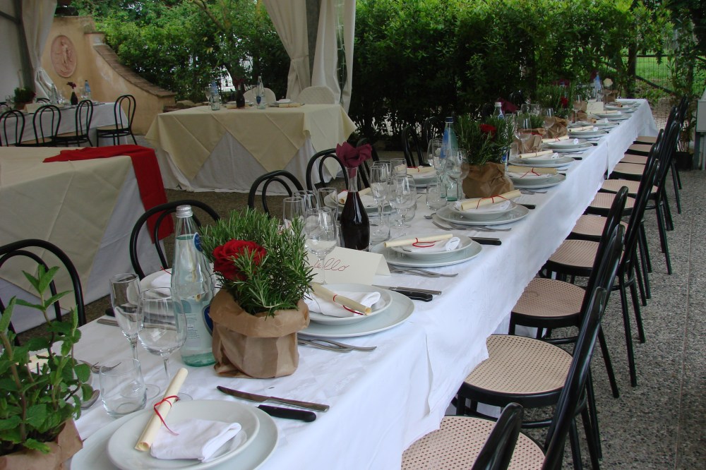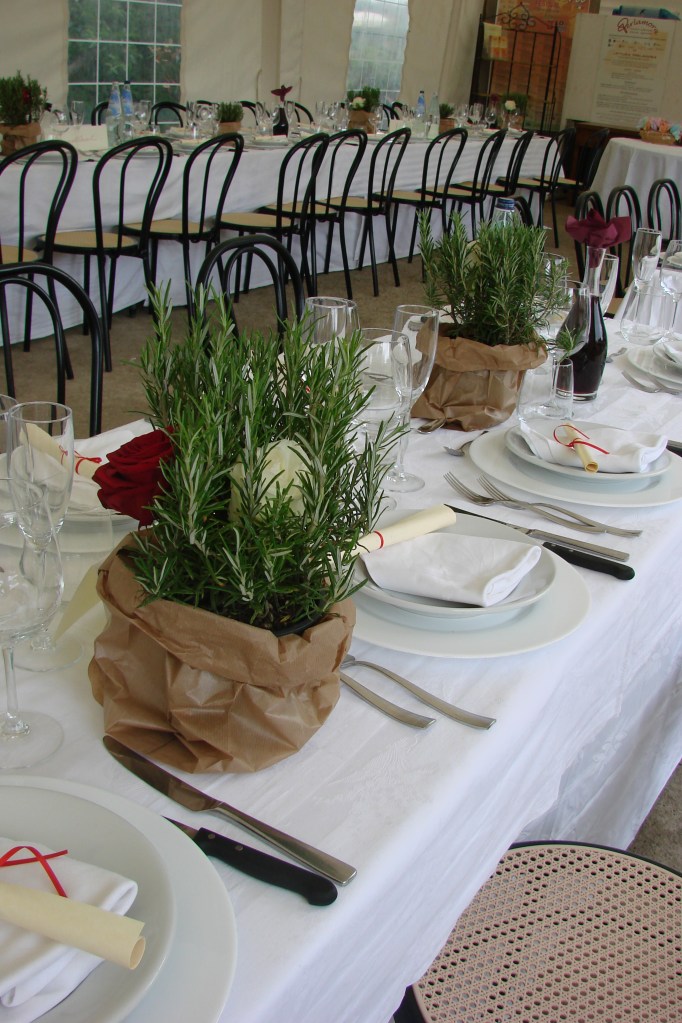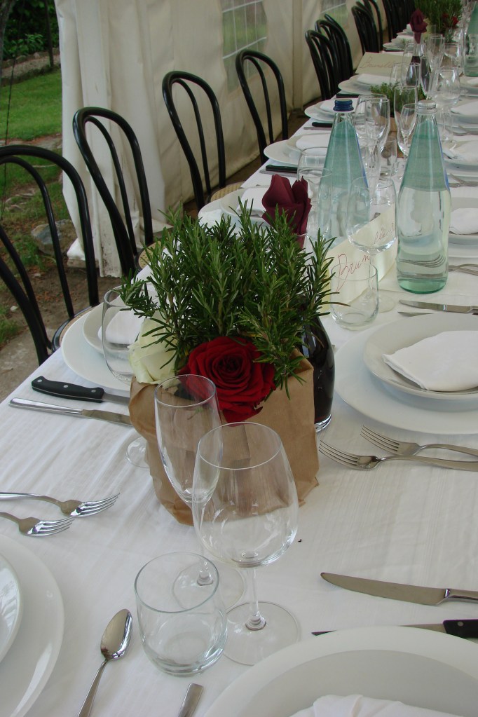 Le rose rosse erano il leit-motif poi, sopratutto per l’allestimento del ristorante dell’agriturismo dovevo inventare io. Sapendo che loro amavano la campagna, avevano un orto e adoravano le spezie gli ho suggerito piantine di rosmarino e menta sui tavoli. Al centro della piantina, tra i ciuffi di rosmarino, una rosa rossa. Per coprire poi il vasino della piantina che era nero l’ho avvolto con un sacchetto di carta marrone, quella che usano i fruttivendoli per la frutta o i panettieri per il pane. A loro l’idea é piaciuta all’istante e l’hanno approvata subito.